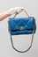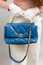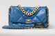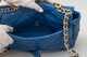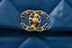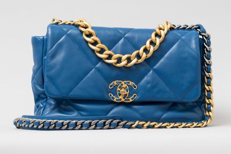 The Chanel 19 in a striking petrol blue shade, introduced in 2019 as a tribute to Karl Lagerfeld's legacy. It combines soft lambskin with bold maxi matelassé stitching and the iconic interwoven metal logo in a gold tone. A chunky chain, inspired by archival models from the 1980s, adds a vintage flair. A handbag that unites tradition, boldness, and the modern face of luxury.