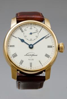 Inside beats the in-house Prokop & Brož PB120 calibre with manual winding, featuring a small seconds subdial at 12 o’clock and a minimum power reserve of 40 hours. The movement is housed in an 18k gold case, complemented by sapphire crystals with anti-reflective coating and a crown engraved with the Laurin & Klement logo. Its distinctive character is underscored by a hand-crafted dial created with Prokop & Brož’s proprietary technology, steel hands tempered to a deep blue shade, and a bovine leather strap signed by the brand.