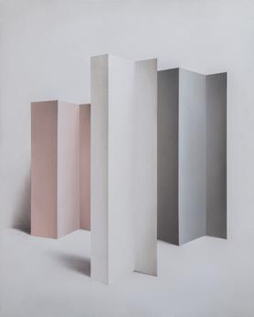 Ira Svobodová is among the most prominent figures of contemporary Czech non-figurative painting. Her work is characterized by conceptual sophistication, utmost focus, precision, and a reduced yet sensitively nuanced palette. Words such as purity, order, or illusion best capture the nature of her canvases, which appear as layered or cut sheets of paper, though in fact they are paintings with illusory geometric modeling. One of her enduring sources of inspiration is modern architecture and its formal language, to which she was drawn during her residency in Rio de Janeiro and through the work of Oscar Niemeyer. Paravan 53 comes from the cycle of the same name, first presented in 2019 at Trafo Gallery. Here, the screen becomes a symbol of intimacy, protection, and a certain mystery. Its variability, combined with a deeper philosophical dimension, provided the artist with a space for highly personal artistic exploration. Svobodová has held numerous solo and group exhibitions, and her work is represented in a range of private collections both in the Czech Republic and abroad.